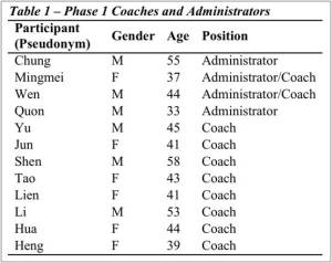 The DISCUSS program had many participants, including coaches, administrators, educators, youth players, volunteers and home stay families. This study, however, focused solely on the Chinese participants (n=12) that travelled to the U.S. in July 2010, who also participated in the second phase of the program, which took place in Shanghai, China in July 2011. The group consisted of two full-time youth soccer administrators, eight youth soccer coaches, and two who were classified as both a coach and administrator. Six of the participants were female and six were male. The average age was 44 and ranged from 33 to 58. Each participant was married, and only two had a good command of the English language (self-reported). Coaching experience among the participants ranged from three to over 30 years, and playing experience ranged from elite professional (including national teams) to no competitive playing experience. See Table 1 for a complete listing of the participants. Pseudonyms were used to prevent participant identification.