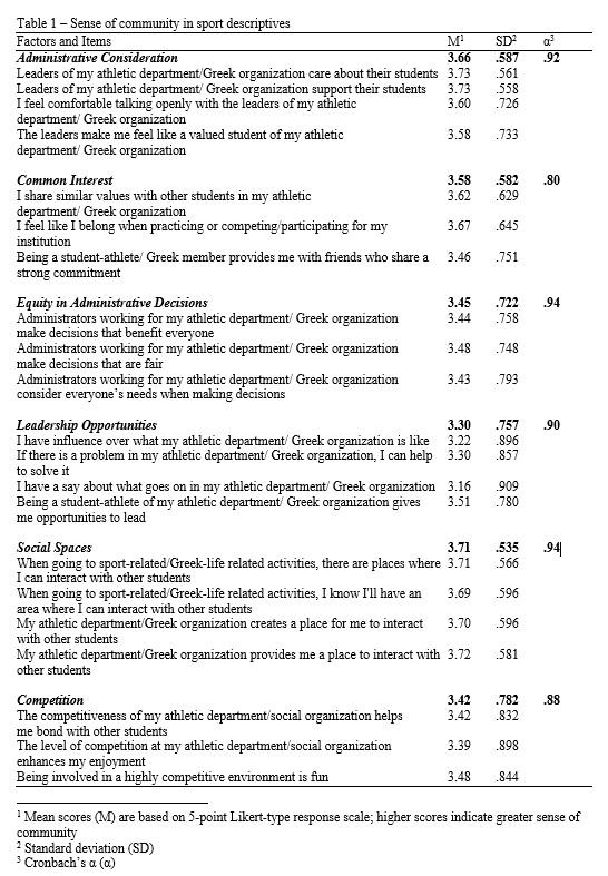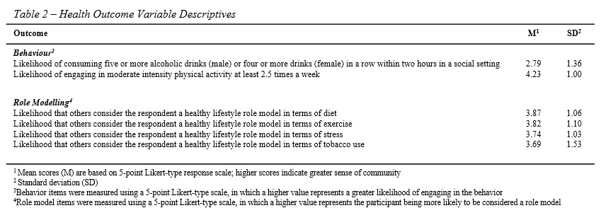 The survey consisted of three sections with a total of 31 items. The first section of the study contained a 21-item Sense of Community in Sport Scale (SCS).18 The SCS consists of 6 Subscales (Administrative Consideration, Common Interest, Equity in Administrative Decisions, Leadership Opportunities, Social Spaces, and Competition), measured on 5-point Likert-type scales. The SCS measure has shown satisfactory reliability and validity in previous research with Cronbach’s alpha scores ranging from .76 to .86 and Average Variance Extracted (AVE) scores ranging from .62 to .72 for each sub-dimension.18 Higher scores indicate a greater sense of community. Table 1 provides an overview of the SCS scale with all sub-dimensions and individual items listed. The second section of the survey consisted of six items related to participants’ overall well-being and healthy lifestyle choices. Two items asked respondents to provide information on the frequency with which they engage in specific health behaviours – one positive (i.e., physical activity) and one negative (i.e., binge drinking). These items specifically asked “How likely are you to engage in moderate intensity physical activity at least 2.5 hours a week?” and “How likely are you to consume five or more alcoholic drinks (males) or four or more drinks (females) in a row within two hours at a social outing?” These items are based on the National Institute of Health recommended physical activity guidelines and definition of binge drinking. Four additional items measured how likely respondents were to believe that others considered them a role model in terms of diet, exercise, stress management, and tobacco use. Social support has been determined to be an important factor in the promotion of positive health behaviours; consequently, the study used role model items as a complement to the behavioural items above. These were all single-item measures examined through 5-point Likert-type scales. Table 1 provides descriptive information for the SCS and Table 2 provides descriptive information on well-being and healthy lifestyle choice outcomes. The final section of the survey contained four demographic questions examining respondents’ gender, race, academic status, and grade point average (GPA).