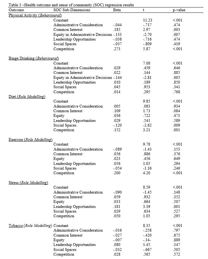 To address RQ1, six multiple regression models were developed to examine the impact of sense of community sub-dimensions on positive health outcomes. The first two regression models contained dependent variables focused on health-related behaviours (physical activity and binge drinking). The final four regression models contained dependent variables focused on role modelling (diet, exercise, stress, and tobacco usage). Independent variables were the same for all regression models and included all six SOC sub-dimensions. For RQ2, an independent samples t-test was developed to examine group differences in sense of community experienced between club sports athletes and social organisation participants. For RQ3 and RQ4, six ANCOVA models were developed to examine group differences in health outcomes between sport club athletes and members of social organisations, controlling for sense of community.
