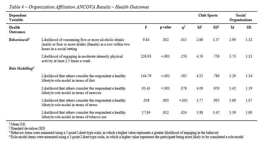 - RQ4: Are there differences in health outcomes between club sport groups and members of university social organisations when controlling for sense of community?