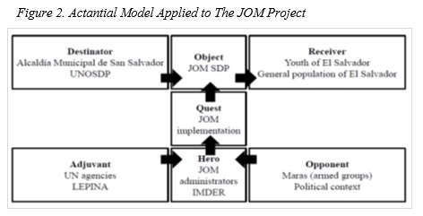 In this case, the Alcaldía Municipal de San Salvador, the UNOSDP (sender), asked IMDER administrators (hero) to develop and implement the JOM project (task) to provide sport for development (object of value) for the youth of San Salvador (receiver) in order to develop future responsible citizens for the country (quest). During their quest, IMDER administrators were helped by UN agencies such as UNICEF, by official laws (LEPINA and Ley de Protección Integral de la Niñez y Adolescencia), and by the Programa Conjunto Reducción de Violencia y construcción de Capital Social en El Salvador (adjuvants). Together, they were facing the maras armed groups and the violent context they impose on the Salvadorian population, as well as the political context with elections (opponents) of political parties who did not support this project. Figure 2 represents the Actantial model applied to the JOM project, and gives a reading of the thematic forces of this story.