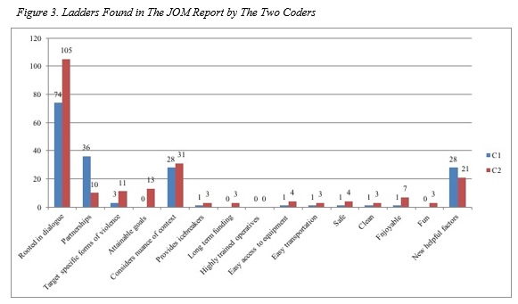 Of the 14 Ladders, both authors conducting the content analysis of the JOM concurred that only 28.5% (n=4) of the theoretical Ladders are found in the report. Specifically, rooted in dialogue was referenced 66 times; Partnerships 5 times; and Consider nuances of context 11 times. Interestingly, 15 New adjuvants, or concepts that practitioners claimed helped their project, but that were not identified in previous literature, were also observed. These previously unidentified adjuvants will be revisited in the discussion section.