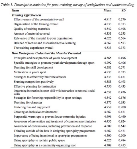 The lower portion of Table 1 displays the descriptive statistics from the training feedback survey, which assessed how well the training helped the participants understand the topics covered during the training. These items were all found to be above 4.4 (out of 5) with fostering fun and enjoyment scoring the highest at 4.96 (out of 5). These self-reported learning gains were supported by checks for understanding captured on video and reflected in field journals. Eighteen of the 19 topics addressed in Table 1 were mentioned in open comments on feedback surveys. The only topic not mentioned directly was concussion awareness, although general references to sport injury response and prevention were made. The topics mentioned most often were youth development, coaching strategies, and the transfer of life skills.