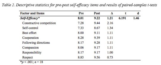 Table 2 displays the mean variables for all items and the self-efficacy for teaching personal and social skills construct administered at pre- and post-training, as well as change in (Δ) scores. The participants who completed both the pre- and post-training survey (n = 18), on average, perceived their self-efficacy levels for the construct and all items to be above 8.6 (out of 10) upon completion of the training programme, with many of the items above 9.1 (out of 10). All items and the self-efficacy construct showed increases from pre- to post-survey administration. Results of the paired-samples t-test are included in Table 2 along with the related Cohen’s d value. The increase across the self-efficacy construct from pre- to post-survey administration was found to be significant (p < .001, t = 6.191, d = 1.46). Moreover, the two items that saw the largest increase after the orientation training related to constructive competition (Δ = 2.16) and best effort (Δ = 1.34); while the two factors that saw the smallest increase related to respect (Δ = 0.73) and responsibility (Δ = 1.00).