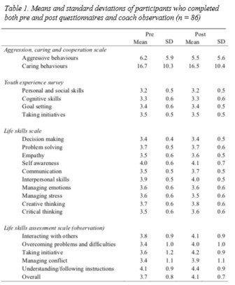 Table 1 provides an overview of the descriptive results of the pre- and post-measures for each variable. A significant multivariate effect for the within subject variable of time was found: [ג (18, 67) = .519; p < .001, eta2 = .48]. Subsequent univariate analyses indicated significant within-subject effects for Communication Life Skills [F(1, 84) = 8.83, p < .01, eta2 = .095] and the Coaches’ overall rating of athletes’ Life Skills [F(1, 84) = 27.14, p < .001, eta2 = .244]. In both cases, the mean score at Time 2 was significantly higher than the reported score at Time 1.