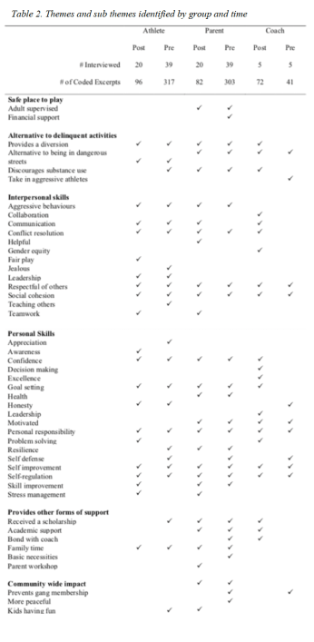 Five core themes related to the impact of the Hoodlinks programme emerged from the qualitative analysis: i) Provides a safe place for youth to play; ii) Provides an alternative to delinquent behaviours; iii) Supports the development of positive life skills (both interpersonal and personal); iv) Provides other forms of support; and v) Has a broader community impact. These themes were consistent from the Baseline interviews and 6-month Follow-up interviews. Table 2 provides a breakdown of the occurrence of each sub-theme based upon time (Baseline and follow-up) and participant (coach, athlete, and parent/guardian).