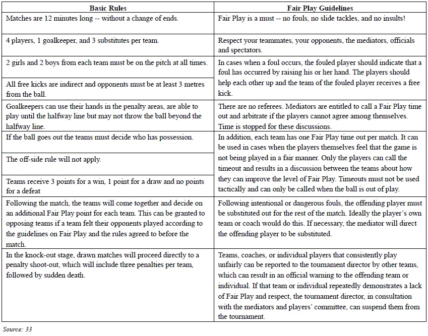 - streetfootballworld. Tournament Regulations. Unpublished document distributed to FFH Festival 2010 delegation leaders, Johannesburg, South Africa. 2010.