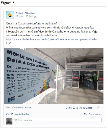 The ‘Cidade Olímpica’ Facebook page, (Olympic City, in English) is an official channel for the Rio de Janeiro City Council, which broadcasts the progress of projects and services that are planned for the 2016 Olympic and Paralympic Games in the city. The study was developed during the 2014 FIFA World Cup, between June 12 and July 13. The period of analysis takes into account the fact that hosting the World Cup placed the country in the international spotlight, and so it is to be believed that the government took this as an opportunity to promote major projects during this period. Thus, this study aims to verify whether the Sport-For-Development discourse has been used to illustrate the legacy of the Olympic Games and particularly the Paralympic Games. In addition, it will judge to what extent the Paralympic legacy has been discussed. As previously observed in the legacy plan for Rio 2016, a key element is to provide an infrastructure for people with disabilities to get around the city as well as ensure access to wider services. It is also clear that this infrastructure must be in place ahead of the Olympic Games in 2016 as the Olympics take place before the Paralympics. Here it is clear that the discourse of “Sport-For-Development” should address these issues in order to justify the investments made for the whole society and for both the Olympic and Paralympic Games.