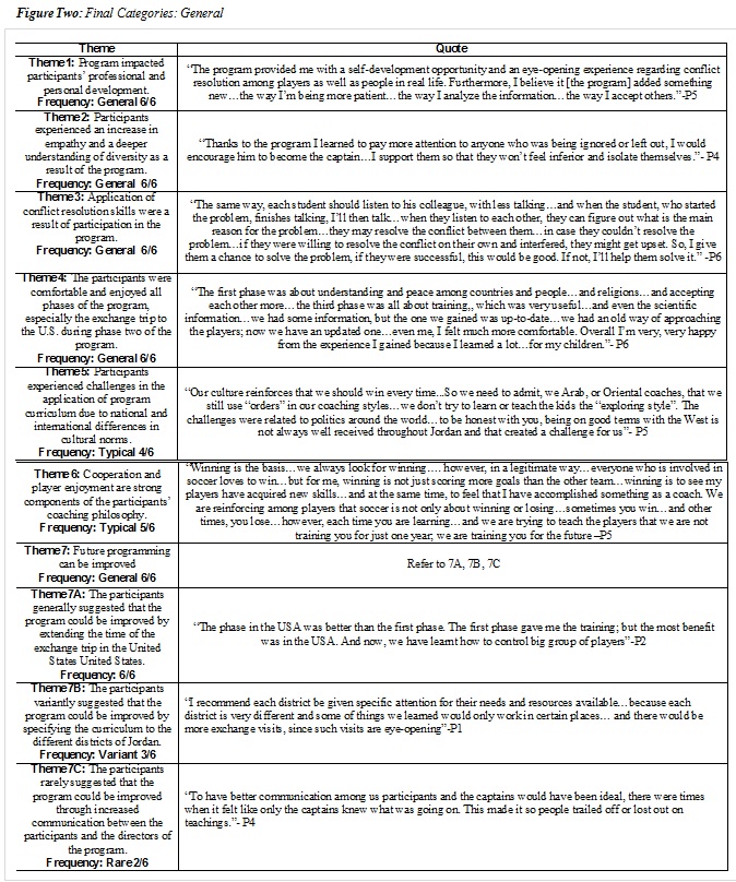 The first phase was about understanding and peace among countries and people . . . and religions . . . and accepting each other more . . . the third phase was all about training, which was very useful . . . and even the scientific information . . . we had some information, but the one we gained was up-to-date . . . we had an old way of approaching the players; now we have an updated one . . . even me, I felt much more comfortable. Overall I’m very, very happy from the experience I gained because I learned a lot . . . for my children. This expressed experience was similar to that of all of the other participants.