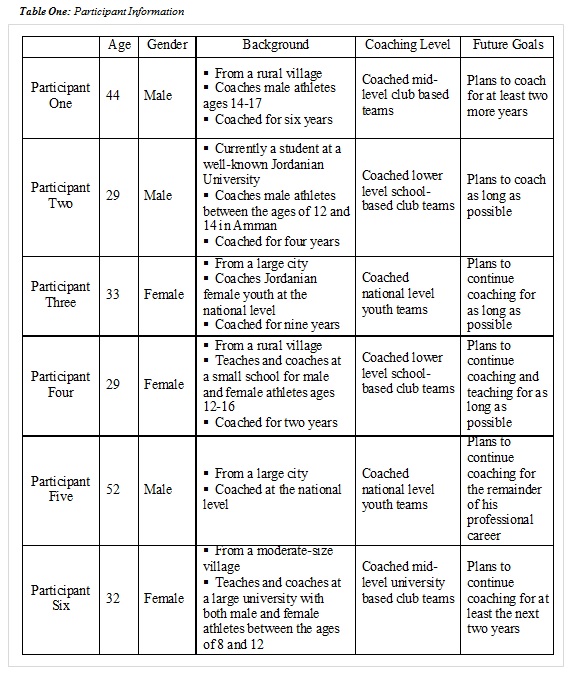 Ten coaches met the inclusion criteria for this project: a) consider the country of Jordan to be their home, and b) have participated in the majority of all sessions throughout all three phases of the SPUJ programme. The sample included six Jordanian youth soccer coaches: three men and three women, ages 29-44 (see Table 1).