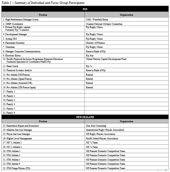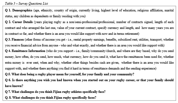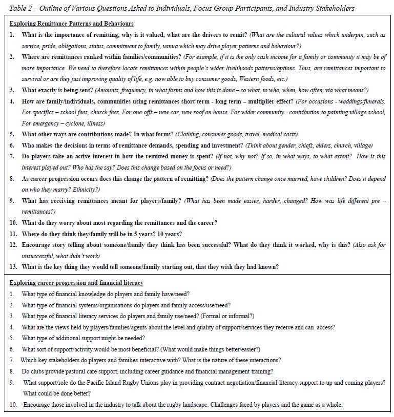 Fieldwork occurred in Fiji and New Zealand. Data collection relied heavily on the use of semi-structured interviews. Ten interviews were conducted with athletes, and 16 with key informants – those with rugby or financial expertise. A focus group with fringe athletes (i.e., those athletes who do not have professional contracts yet but are on the verge of signing) and focus groups with five families were also conducted. Interviews with athletes, family and Fijian based key informants were conducted mostly in Fijian, underpinned by the notion that a richer understanding comes from participants using their own vernacular. The approach to recruiting participants for the semi-structured one-on-one and focus group interviews was purposive snowballing. Table 1 summarises the individual and focus group participants. Table 2 outlines the types of questions asked to individuals and focus group participants.