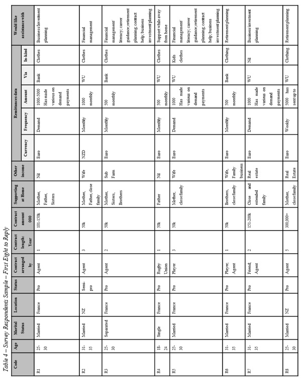Finally, understanding the impact of sport-generated remittances should also include the non-professional athlete’s contribution. Non-professional athletes may leverage their athletic talents into non-sport employment. This non-sport employment provides the basis for the remittances. Many athletes see themselves as semi-professional, and even though playing in a second tier competition in New Zealand may not provide them with a professional-level salary, it can still be an entry point into opportunities in France; for example, semi-professional athletes can sometimes go on to receive a full-time sports salary. Thus we argue that it is important to not underestimate the importance of semi-professional athletes who also remit.26,27 Of the 70 Fijian responses to our survey, almost half the athletes identified themselves as semi-professional, which meant that they were working part- or full-time as well as earning a salary playing sports. These athletes will thus be likely to earn (and remit) more than a migrant with a non-sport related full-time job (e.g., someone involved in the RSE scheme).
