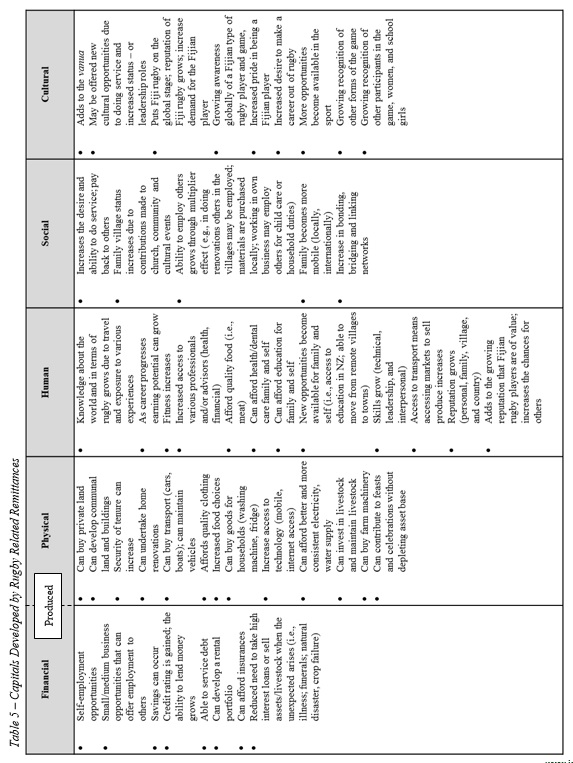 It is within this context that this research explored the way that iTaukei, indigenous Fijians, are using rugby as a livelihood means by asking: what is the development impact of rugby-generated remittances for their families, and more broadly in terms of their communities. We asked more explicitly whether capitals were being built and if so what types. Then we asked how these capitals were contributing to choices and opportunities today and in the longer term. Thinking about the longer term required us to consider the factors that impede the permanency of the choices and opportunities.