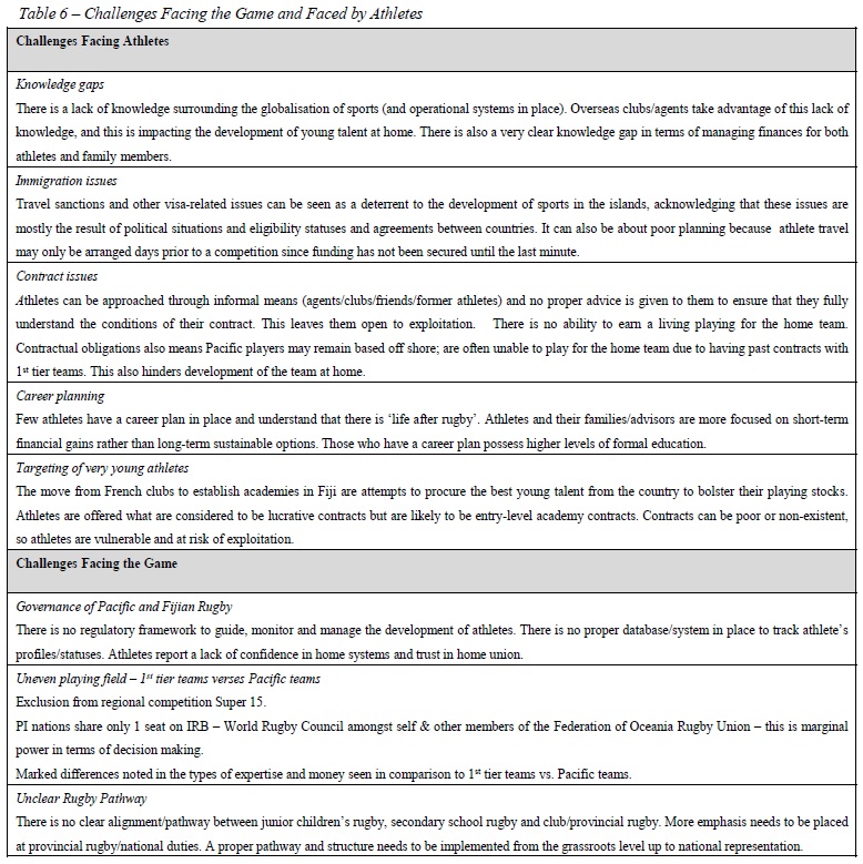 Players acknowledged their lack of financial literacy. One athlete participant lamented:“My biggest regret is not having any financial support or advice earlier in my rugby professional career.”Finally, there are also many challenges facing the development of Pacific Island rugby, which also seems to hinder those looking to use the game for livelihood purposes. These are summarised in Table 6 below.