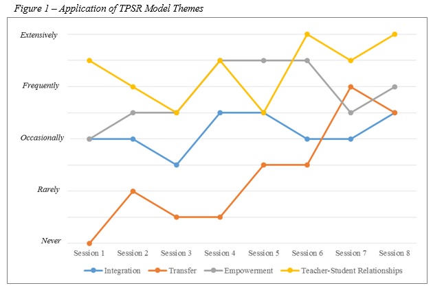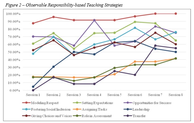 Additionally, both TARE instruments were analysed separately, beginning with the programme leaders’ (combined) use of the teaching strategies associated with the TPSR model. Because the TARE: Observation Instrument required the second author to indicate the presence of nine responsibility-based strategies associated with the TPSR model over five-minute intervals, these data were analysed based on the frequency of each teaching strategy during each session, with percentages calculated for each session (e.g., respect was modelled by the programme leaders 92.86% during the sixth session). The TARE: Post-Teaching Reflection required the first author to assess all teaching strategies after each session through a five-point Likert scale (0 = Never, 4 = Extensively), with these data converted to percentages (e.g., respect was modelled by the programme leaders ‘Extensively’ during the sixth session, with a 4 on the Likert scale, which was converted to 100% for that session). The analysis of the remaining subsections of the TARE instruments was less complex, with the rating of personal-social responsibility themes and student responsibility behaviours assessed through five-point Likert scales. The means for all subsections were then computed between the two TARE instruments.
