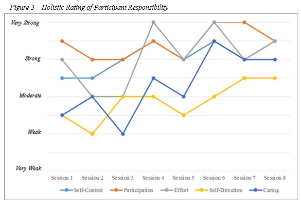 The specific themes related to skills the participants learned are explored in Table 2, along with participants’ intention to transfer these skills into other domains (Level V of the TPSR model). Additionally, Figure 3 represents the holistic rating of participant responsibility observed over the eight sessions, with the growth of participant responsibility demonstrated. Thus, in addition to participants’ self-reported outcomes, independent observers also noted positive changes throughout the programme. Given the purpose of the current study, an understanding of how the programme facilitated these changes is necessary. These connections are explored in the following section.