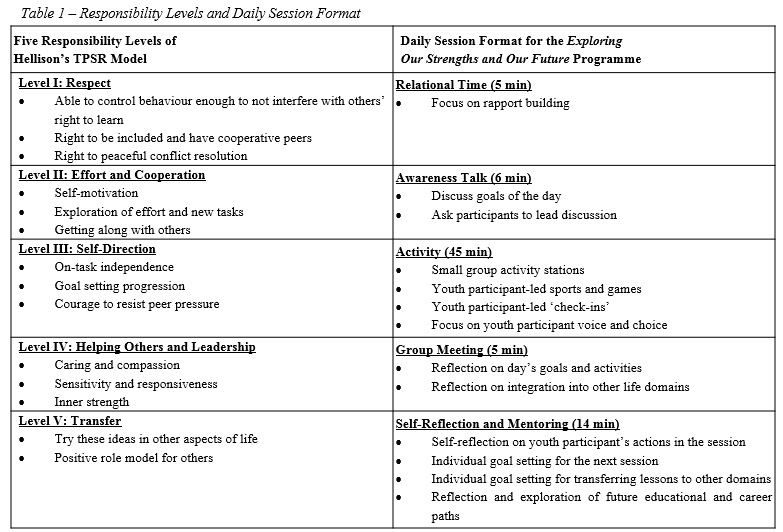 The TPSR model has been used with a variety of populations (e.g., gang-affiliated youth, girls from low-income families, and refugee youth) and settings (e.g., after-school, in-school, community-based, and global), with research citing the model’s effectiveness.13-15 More specifically, Bean and colleagues13 found that TPSR was particularly effective due to the inclusion of intentional leadership opportunities for female participants, support for participants’ active engagement in various physical activities, and strong communication amongst the leaders. Buckle and Walsh14 cited the importance of taking a strength-based approach in their programming with gang-affiliated youth, along with developing mutually respectful relationships with the youth and continually challenging their use of newly acquired life skills in other domains. Through programming that created this environment, Buckle and Walsh reported that gang-affiliated youth developed positive cognitive, emotional, social, behavioural, and physical skills, along with increasing their internal assets (e.g., positive identity, self-control, and commitment to learning) and external assets (e.g., empowerment, support, and expectations).