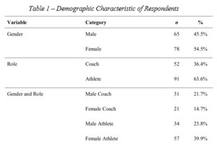 All individuals who completed both the pretest and post-test further identified their gender and specific role as either a coach or athlete. The demographic data of the final sample used for analysis is outlined in Table 1.