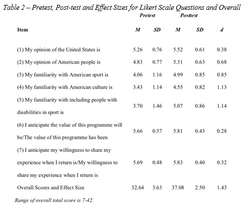 The range of effect size indicates that gains from pretests to post-tests were small for items one, six and seven, medium for item two, large for items three, four and five and very large for overall total mean scores. These figures indicate that the programme is having a strong positive impact on participants as a whole. Participant comments support these findings: “This programme was extremely valuable, well planned and it fulfilled all its objectives. All my expectations were met and I definitely took valuable pointers from the different sessions that will be of great importance.” The idea that change can occur in such a short time was also reflected, “The experience that you have given us has completely changed my life and my way of thinking” and “This programme has changed my perspective on sports and disability and I hope you continue to promote similar programmes.” Some objective-specific elements are affirmed, “My trip here has taught me a great amount about the people, the culture and has made me a better person” and “Participating in this programme was very valuable to me. I was able to reflect about my thoughts and attitudes at work, particularly towards people with disabilities.” Gratitude was a common theme in the comments, “Thank you for everything you did for us! The experience that you have given us has completely changed my life and my way of thinking. I am sure it changed my fellow participants’ life too! Thank you!” Several participants indicated the desire to return and many suggested the need to continue programmes such as this.