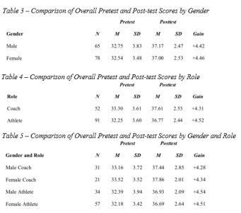 Because of the very large overall programme effect size, it was important to determine whether gains were more significant for some participants than others. In this study, analyses based on gender, role (coach/athlete), and the combination of the two (gender/role) were used to generate a comparison of overall mean scores for pretests and posttests as well as gains for each independent variable analyzed.