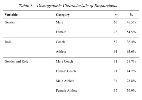 All individuals who completed both the pretest and post-test further identified their gender and specific role as either a coach or athlete. The demographic data of the final sample used for analysis is outlined in Table 1.