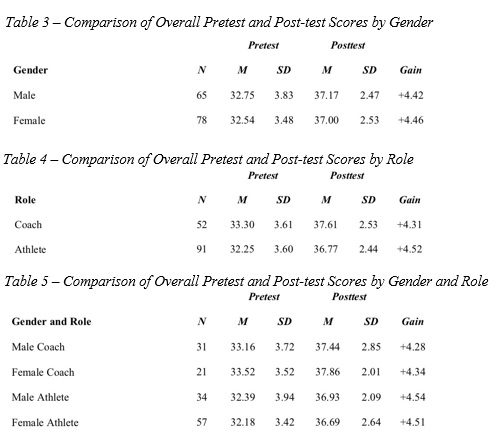 Because of the very large overall programme effect size, it was important to determine whether gains were more significant for some participants than others. In this study, analyses based on gender, role (coach/athlete), and the combination of the two (gender/role) were used to generate a comparison of overall mean scores for pretests and posttests as well as gains for each independent variable analyzed.