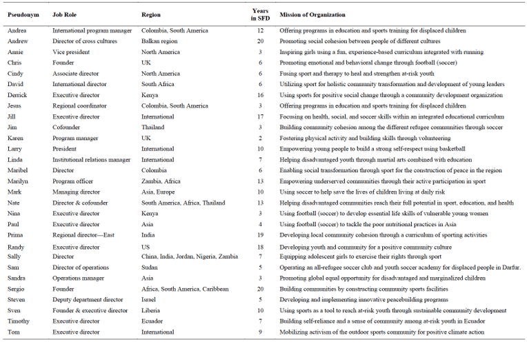 In an effort to assess the perspectives of SFD practitioners, we engaged in an exploratory qualitative study that involved criterion based purposive sampling (Creswell & Poth, 2018). Considering the nature of this data collection and its analysis, it is important to include the positionality of the authors to provide background on their perspectives. Each author is a full-time academic and has extensive experience in SFD research efforts and qualitative data collection. The second and third authors have both worked with the NGO industry as practitioners and academic collaborators (24 years and 14 years respectively), including several recent projects. Considering the prior experience and knowledge of the authors, the study was approached from a constructivist paradigm (Ponterotto & Grieger, 2007) recognizing our background would influence our interpretation of the data. Specifically, our criterion-based purposeful sampling (Duan et al., 2015) aimed to collect data that could represent the global SFD field. Through SFD field recognized online platforms (Beyond Sport and SportandDev), we developed a short list of 60 diverse organizations based on three criteria: (a) the organization is currently active and viable, (b) the organizations represent diverse locations (e.g., low- to middle- and high-income nations) across all six continents, and (c) the organizations have variety in programming (e.g., type of sport employed, mission, targeted demographic). Emails were sent by the first author to key stakeholders at the 60 organizations (e.g., CEOs, top-level managers, and directors) inviting them to participate in a personal interview about their perspectives on advancing the field through effective management of their organizations. After two weeks, follow-up emails were sent to nonresponders. In total, 29 individuals representing 28 organizations volunteered to take part in this study, which entailed conducting semistructured Skype or phone interviews with the second and third authors in order to gather in-depth, robust data (Creswell & Poth, 2018). Two interviewees were working for the same organization as we had initially contacted one individual from that organization who did not respond, so we contacted another. However, the individual who did not respond later agreed to participate. Interviewees represented six continents and a wide range of organizations employing different sports and with varied missions. Table 1 details the 30 individuals.
