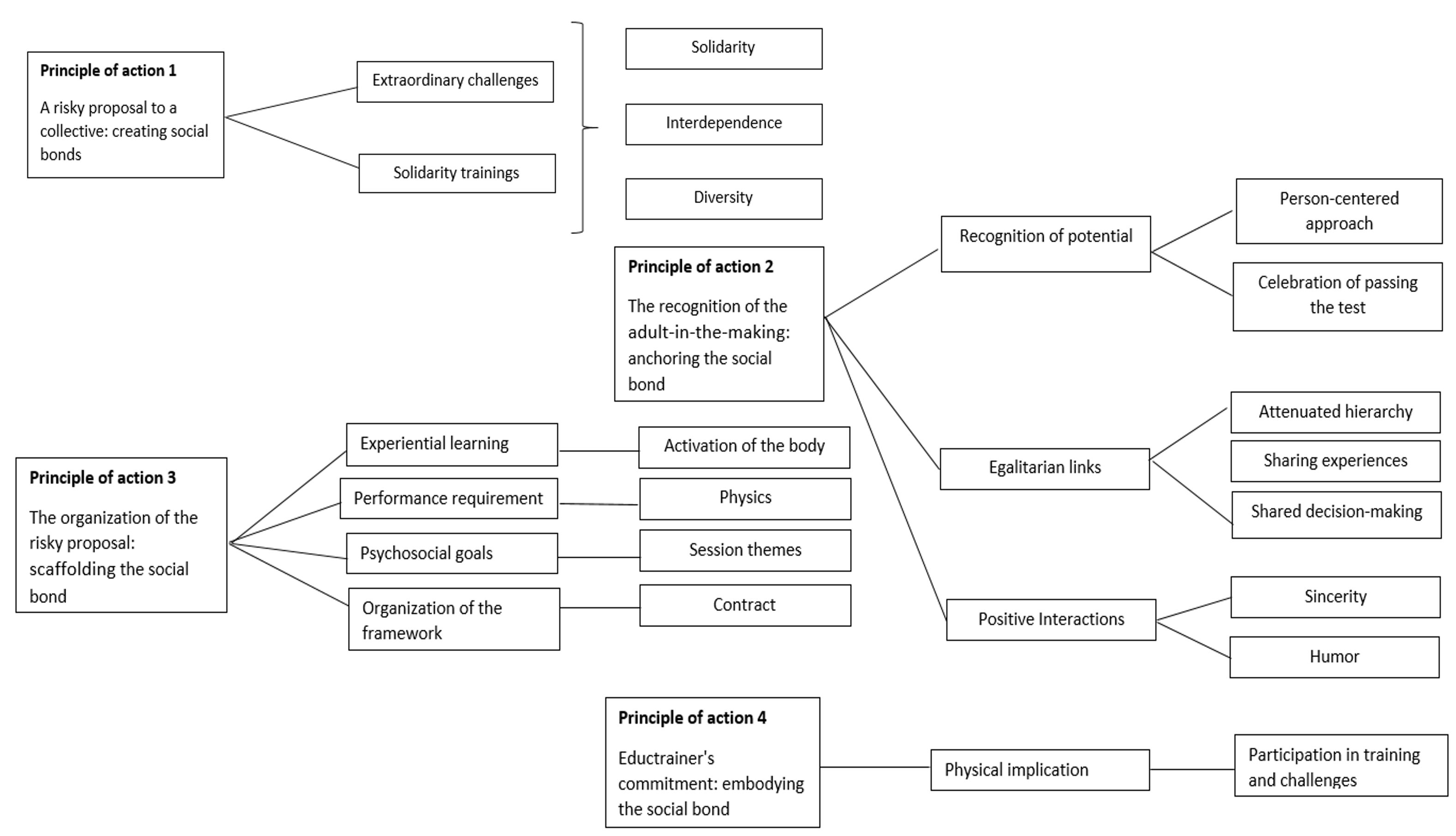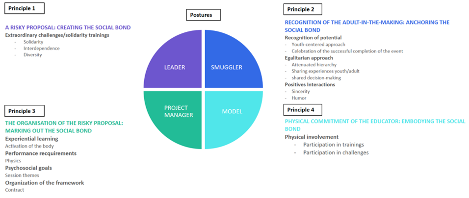 The results pointed to four risk-based principles-of-action to support social bonds. Principle 1: a risky proposal made to a collective that enables the creation of a social bond. Principle 2: the recognition of young people as adults-in-the-making and the achievement of extraordinary challenges that anchor them to the adult world. Principle 3: organization of the risky proposal and a clear framework within which social bonds are built. And Principle 4: the physical commitment of eductrainers that positions them as models who embody social bonds. Active ingredients and constituent values have been identified for each of these principles-of-action.