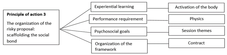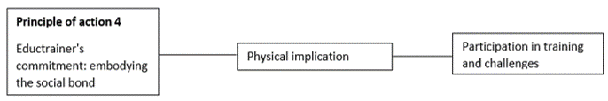 The eductrainer made a risky proposal to a collective, which relied on the achievement of extraordinary challenges and solidarity training. These challenges and trainings fostered the emergence of gestures of solidarity and situations of interdependence to support the creation of social bonds. This risk is necessary in the process of creating social bonds. The level of risk used by the eductrainer to create social bonds is a subtle balance between the preferential risk and the youths’ perceived risk. To play on this mix, the eductrainer can dramatize (Visioli et al., 2015) the perceived risk and/or increase the level of real risk.
